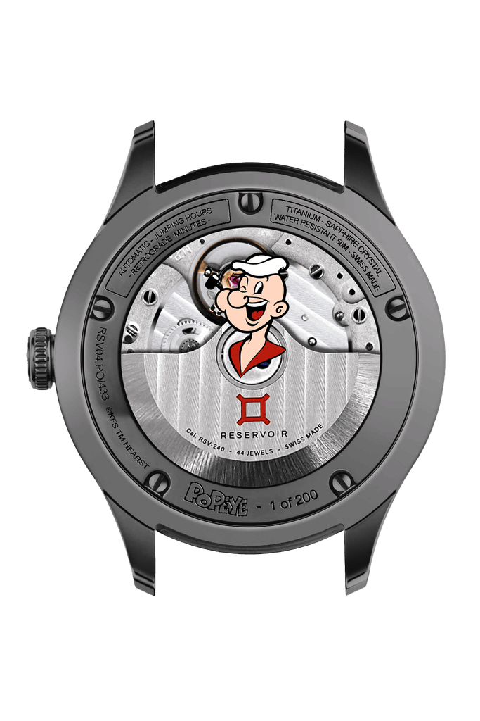 Dans la montre Reservoir x LabelNoir x Popeye, le RSV-240 permet l’affichage de la minute rétrograde et de l’heure sautante susmentionnées sur le cadran, avec une réserve de marche de 56 heures assurant un fonctionnement durable et fiable. Le calibre signé Reservoir présente une finition avec des rayures de Genève et un brossage de style radial, le tout visible via un fond en verre saphir orné d’un Popeye qui cligne de l’oeil, peint en son centre.