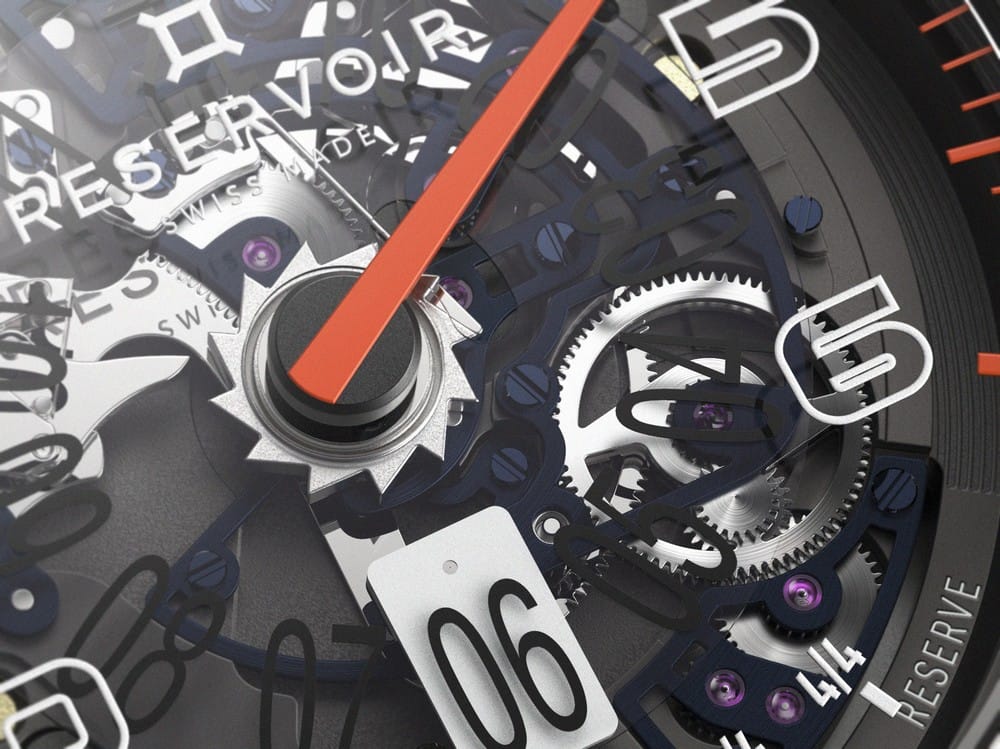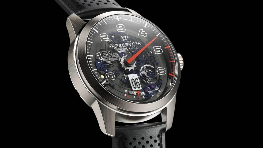 Avec sa nouvelle GT Tour Skeleton, Reservoir dépasse à nouveau les apparences. L’essence de l’un de ses modèles phares, influencé par l’automobile sportive, est révélée. Comme pour une voiture de compétition, l’allègement de tout ornement superflu permet de révéler les éléments fondamentaux, d’atteindre la quintessence. Transparent, le cadran ouvert s’efface. L’action de l’aiguille rétrograde des minutes, colorée d’une teinte orangée évocatrice des tableaux de bord de compétition, est encore plus spectaculaire. Les ponts de cette montre squelette apparent, traités dans un bleu profond, contrastent avec l’acier brossé de la partie circulaire et des complications. Détails subtils, si les vis parfaitement bleuies se font oublier, le motif intérieur sculpté des roues de différentiel, semblable aux papillons de fixation de roues, n’échappe pas aux amateurs de bolides de caractère. Innovant, le cartouche de l’heure est pour la première fois traité en SuperLuminova blanc, garantissant la lecture nocturne, tandis que le disque d’indication des heures est en plexiglas transparent. Un dispositif complémentaire aux index et logos imprimés sous le verre saphir.