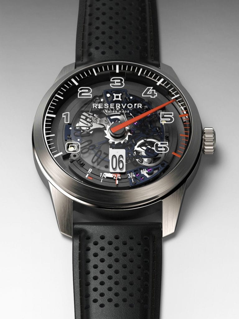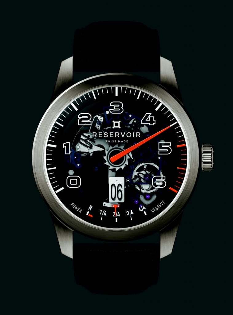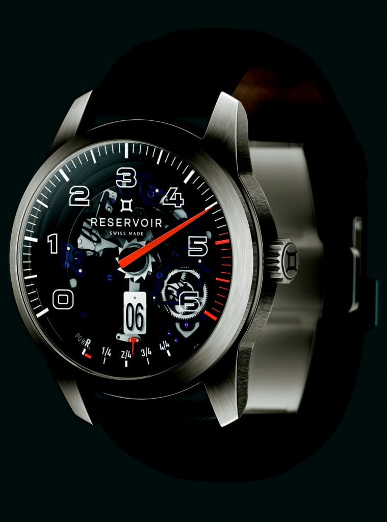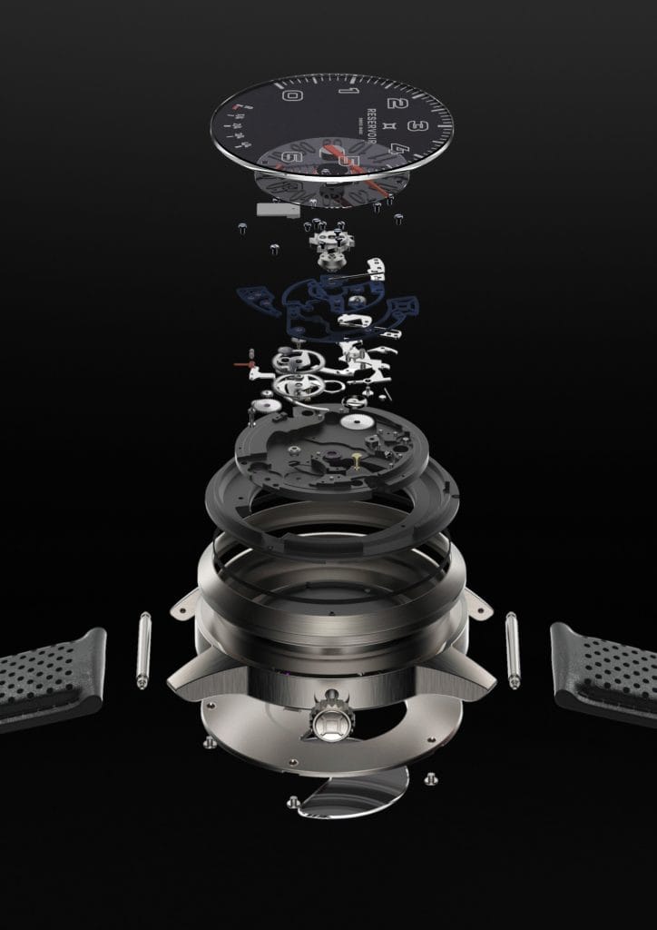 Reservoir fait sien ce savoir-faire, avec un parti pris engagé : mettre de côté tout effet décoratif ou de gravure pour tendre vers l’épure. Aller à l’essentiel. Souligner la quintessence. Mettre en lumière la construction de ses trois complications identitaires – minute rétrograde, heure sautante et affichage de la réserve de marche. Ainsi le ballet mécanique des composants du module est libéré : action de libération du limaçon, armement du marteau de rétrograde, débrayage de la sécurité anti horaire.