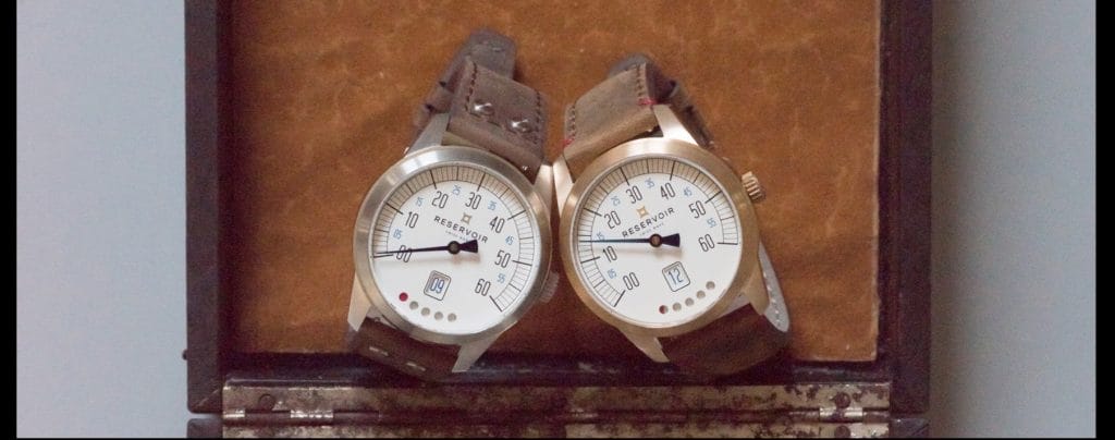 Cadran blanc, aiguille bleuie, index industriels noirs bleus, bracelets en cuir vieilli, les deux modèles TIEFENMESSER, avec leur unique guichet pour l’heure, affichent ici une réserve de marche sous forme de jauge mécanique à fond rouge. Etanchéité 50 mètres pour ces deux versions submersibles.