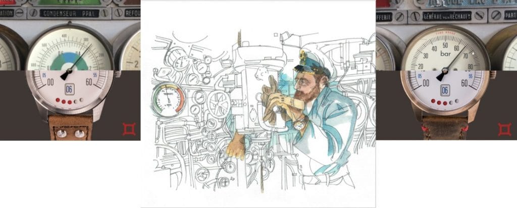 La collection TIEFENMESSER de RESERVOIR s’inspire des matériaux caractéristiques des équipements sous-marins : acier des instruments de mesure de pression et de profondeur, bronze ou laiton d’un périscope signent la singularité des modèles.