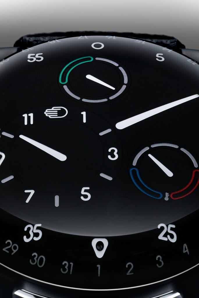• Cadran convexe en titane de grade 5 (Diamètre de 250mm) avec 4 satellites excentriques biaxes inclinés à 3° (heures), 4,75° (jauge thermique et jour de la semaine) et 6,25° (trotteuse)