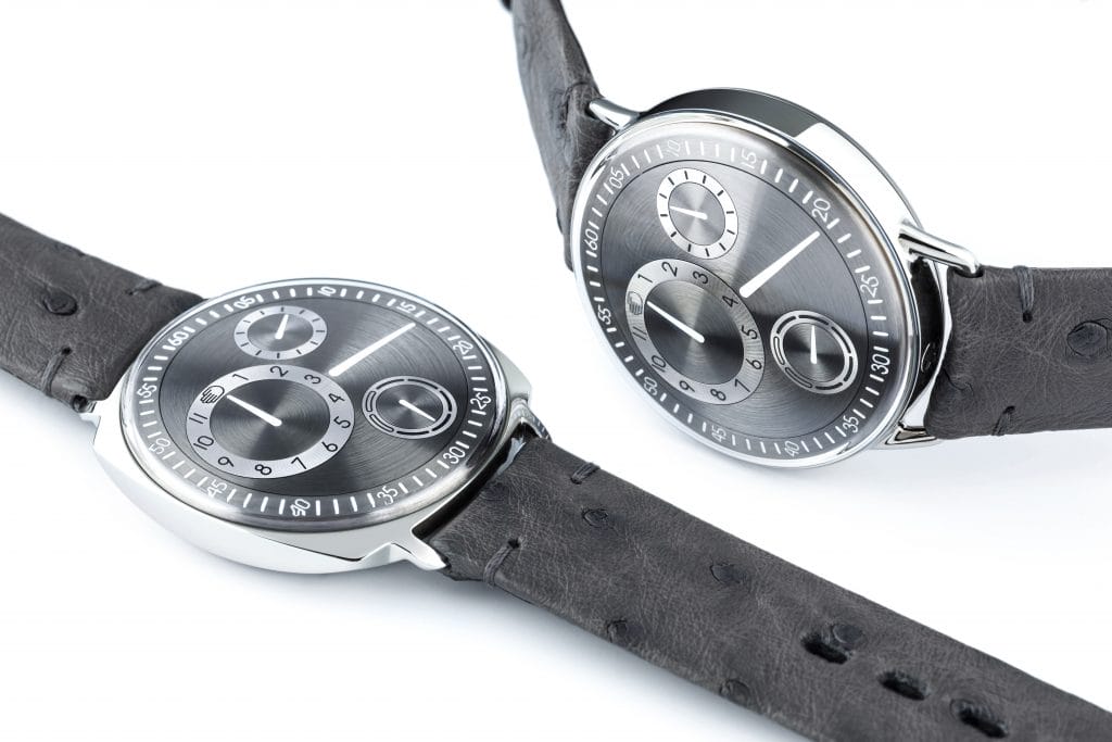 Les boîtiers des TYPE 1 sont plus plats, du fait de l’absence de fond saphir faisant fonction de couronne ; on découvre à la place un petit levier escamotable dont le maniement ajoute un nouvel effet visuel saisissant : lors de la mise à l’heure la rotation du levier correspond exactement au mouvement des disques sur le cadran dans un rapport de 1/1. Une réminiscence Up to Date de la clé utilisée autrefois pour remonter les montres et les jouets mécaniques.