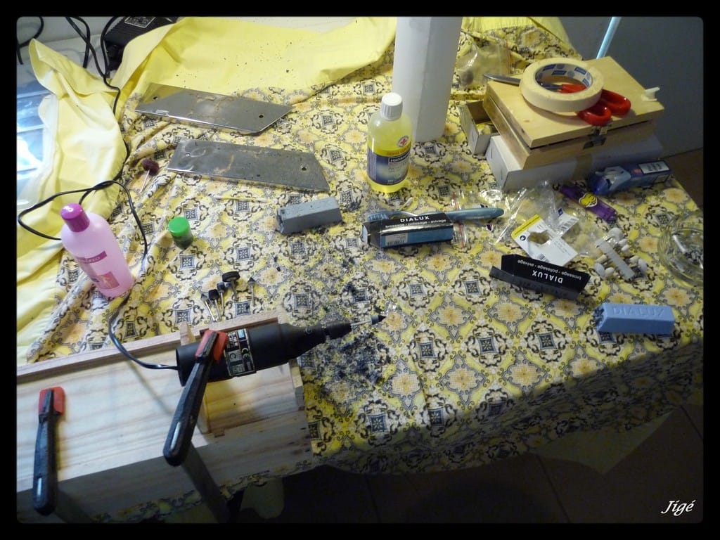 Et mon tour à polir maison constitué d’un Dremmel astucieusement fixé sur une boîte de champagne…
