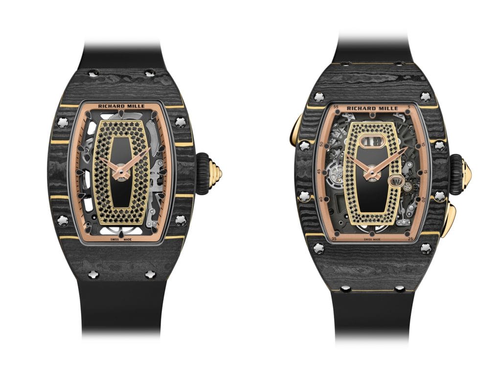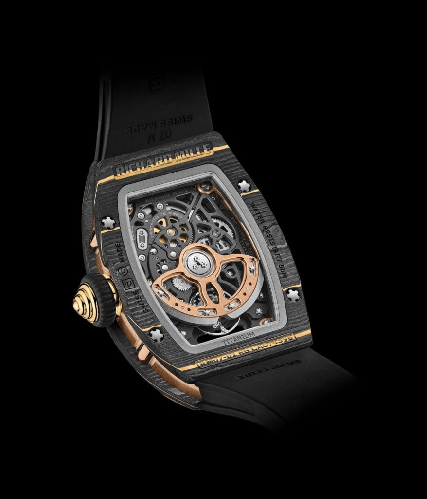 La RM 037, quant à elle, révèle à l’œil chaque détail du calibre CRMA1, mouvement maison squeletté à remontage automatique, dont elle est dotée. Les contrastes entre surfaces satinées, brossées, biseautées, microbillées et polies noires viennent rehausser la prouesse technique dont ils témoignent.