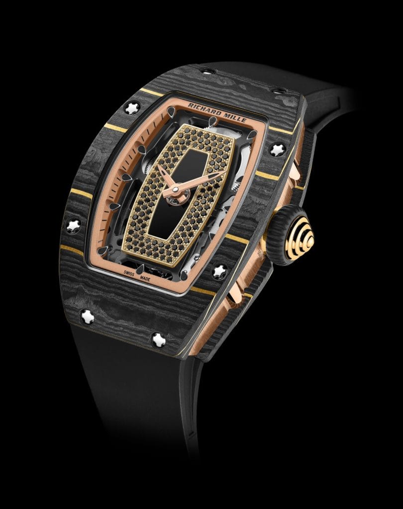 Et justement. Richard Mille présente, après 4 ans de mise au point, le rendu si singulier de ce matériau exclusif sur deux modèles, pensés et conçus pour les femmes : la RM 07-01, et la RM 037, chacune ayant un cadran serti de saphirs noirs et accueillant en leur centre de l’onyx.