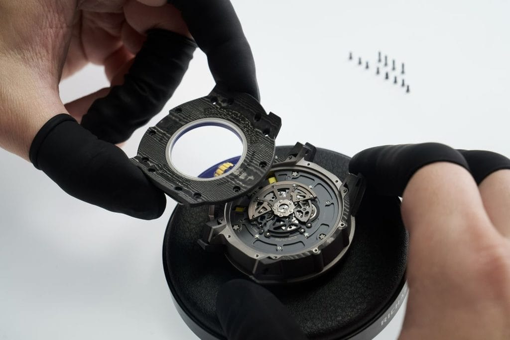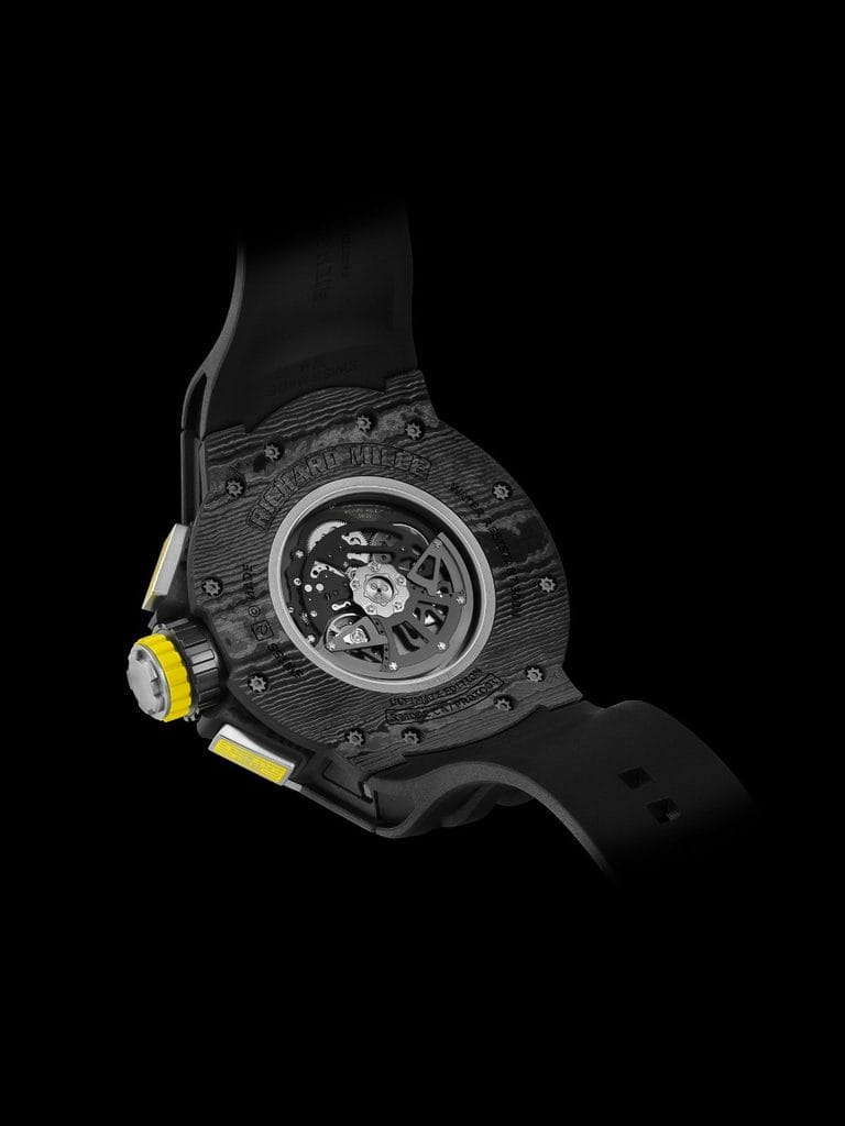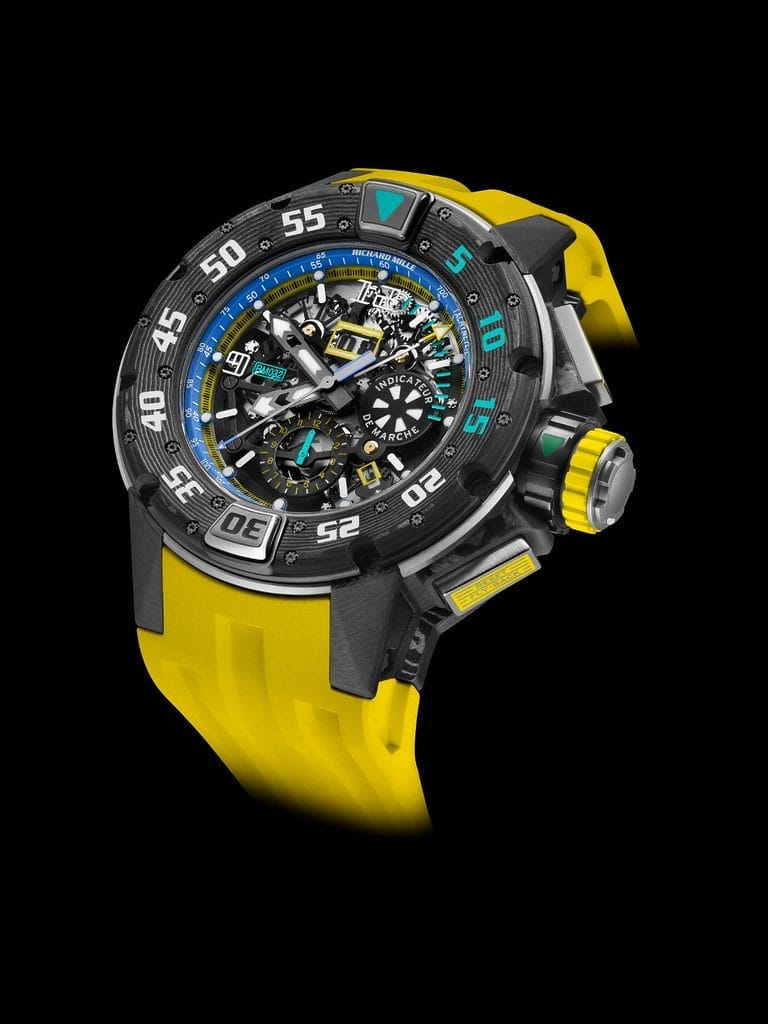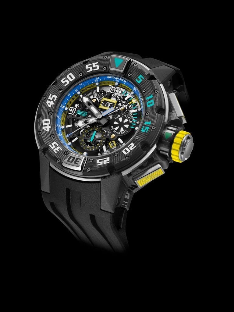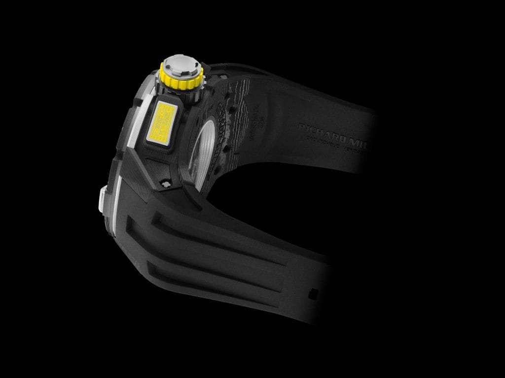 Afin de prévenir toute activation accidentelle des poussoirs sous la pression exercée par l’eau, Richard Mille a breveté une couronne verrouillable. Cette innovation, combinée à un système d’étanchéité optimisé, garantit une sécurité optimale. Les bagues rotatives de la couronne et des poussoirs indiquent leur statut : vert pour déverrouillé, rouge pour verrouillé.