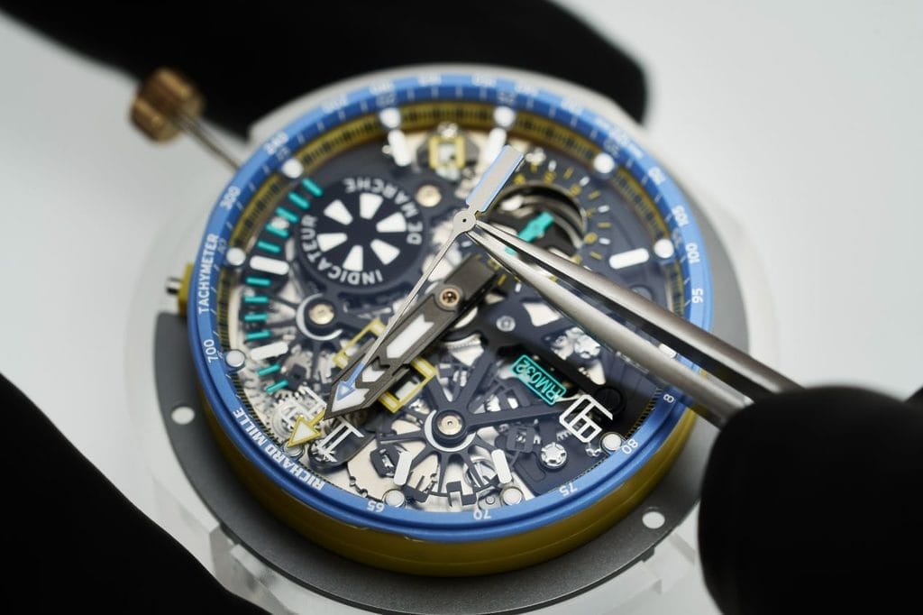 Pensée pour les plongeurs en eaux profondes, la RM 032 Ultimate Edition priorise sécurité et lisibilité. Elle propose les fonctions essentielles : heures, minutes, secondes, un chronographe flyback avec compteur de 12 heures, et un calendrier annuel avec une date agrandie à 12 heures et un guichet des mois entre 4 et 5 heures.