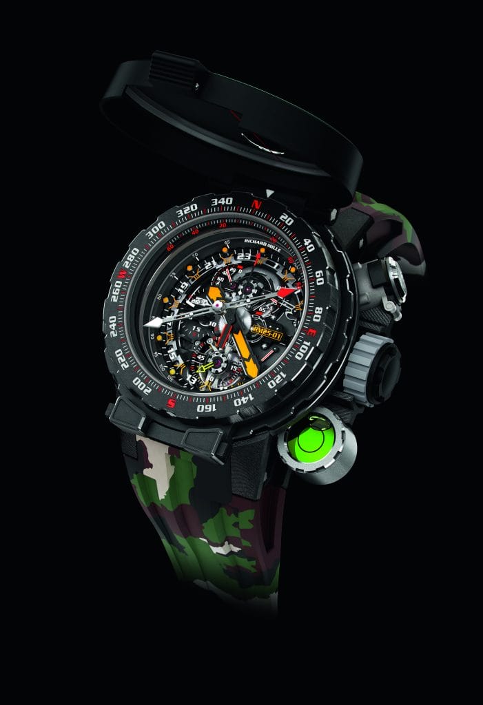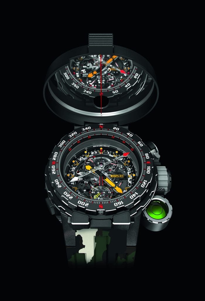 La RM 25-01, étanche jusqu’à 100 mètres, est livrée avec deux lunettes amovibles spécifiques. L’une est une boussole en titane grade 5 traitée DLC, composée d’une lunette fixe et d’une lunette tournante, et venant se fixer rapidement sur la carrure grâce à un système de type « baïonnette ». Son couvercle en Carbone TPT® accueille un miroir et une ouverture à 12 heures pour une orientation plus précise avec l’aiguille de la boussole. Ses glaces saphir avec traitement antireflets multicouches sont revêtues d’une barrière antimagnétique pour éviter toute perturbation entre le mouvement et la boussole. Un niveau à bulle, situé à 4 heures, permet d’assurer le positionnement bien à plat de la montre pour un meilleur ajustement de visée. Une fois détachée, la boussole peut être fixée sur une plaque en Carbone TPT®. Idéale pour l’orientation, elle affiche entre autres informations les lignes indiquant la direction à suivre lors d’une progression suivant un cap et une carte.