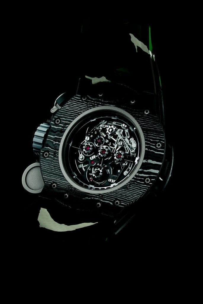 Sa platine et ses ponts usinés dans du titane grade 5 maintiennent efficacement une mécanique associant la complication du tourbillon et la complexité d’un nouveau mouvement chronographe dit « de compétition ». Plusieurs mois auront été nécessaires aux ingénieurs de la marque pour optimiser le calibre : ils ont réussi à en réduire le poids tout en augmentant sa précision ainsi que la fiabilité de la mesure du temps sur le long terme. La diminution de l’inertie générale s’accompagne ainsi d’une consommation d’énergie réduite de 50 %. La qualité de la réserve de marche de 70 heures, vérifiable à l’aide des indicateurs de couple et de fonction, anime un affichage atypique de l’heure sur 24 heures, indispensable s’il advient à son propriétaire d’être privé de la vue du repère que constitue le soleil. Mise à l’honneur sur ce boîtier rond, la combinaison du titane et du Carbone TPT®, carbone inaltérable et désormais signature graphique de la marque, permet de limiter considérablement le poids de la montre.