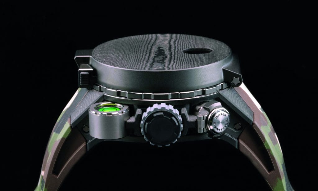 Cette boussole peut être remplacée par une lunette bidirectionnelle en Carbone TPT® et titane, indiquant les quatre points cardinaux et disposant d’un disque gradué sur 360° et d’une échelle 24 heures. Son utilisation ne requiert aucun calcul. Il suffit de placer l’aiguille des heures face au soleil puis de régler la lunette tournante de manière à ce qu’elle pointe l’heure locale inscrite sur cette dernière et permette au porteur de situer le nord, l’est, le sud et l’ouest, quel que soit l’hémisphère dans lequel il se trouve. Situé à 2 heures, un compartiment en titane grade 5 fermé hermétiquement peut recevoir des pastilles de purification d’eau permettant de rendre buvable, en 30 à 120 minutes selon son degré de pollution, un litre d’eau de n’importe quelle provenance. Pour parfaire l’esprit d’aventure émanant de cette édition limitée de 20 pièces pensée avec Sly, un bracelet sculptural en caoutchouc naturel à motif de camouflage et une solide boucle ardillon en titane grade 5 viennent maintenir fermement contre le poignet cet imposant boîtier aux courbes ergonomiques comme seule la marque sait les concevoir.