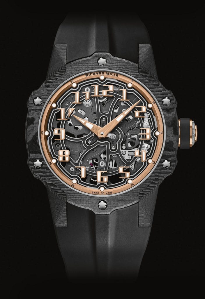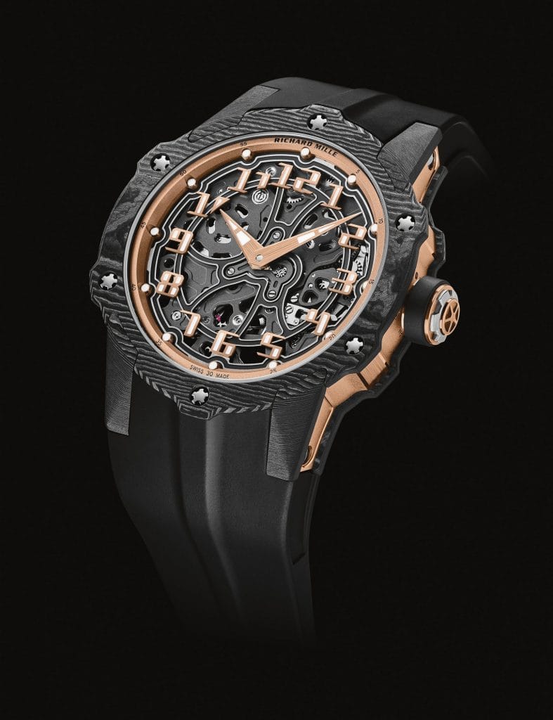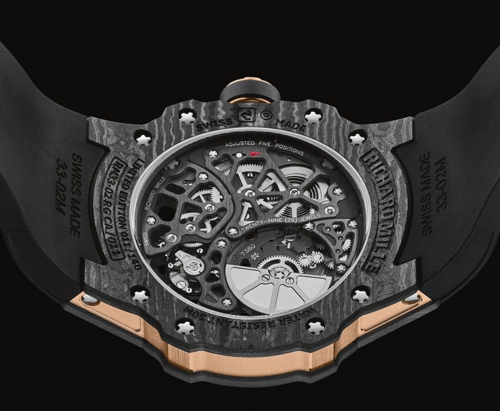 Jouer de la douceur de l’or opposée à la force du Carbone TPT®, tout comme allier les codes graphiques des univers lifestyle et sportif conjugués au masculin aussi bien qu’au féminin, illustrent la volonté qu’a Richard Mille de combiner au sein d’une montre des univers réputés antinomiques. La RM 33-02 Automatique est proposée en série limitée de 140 exemplaires.
