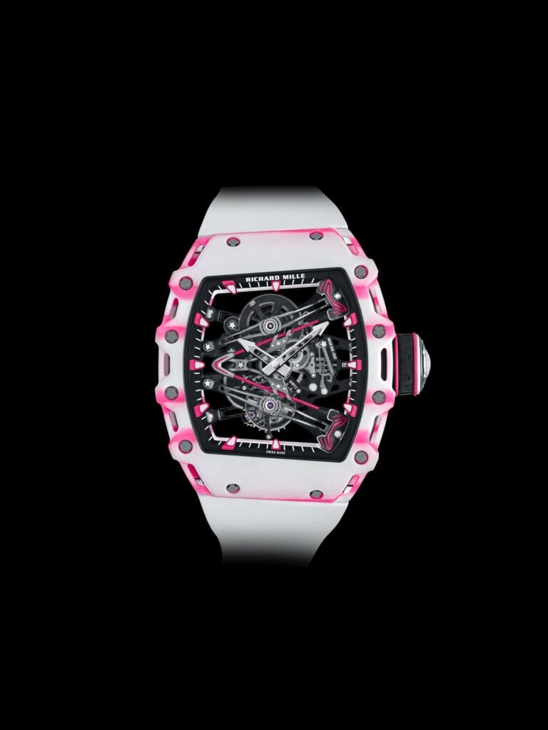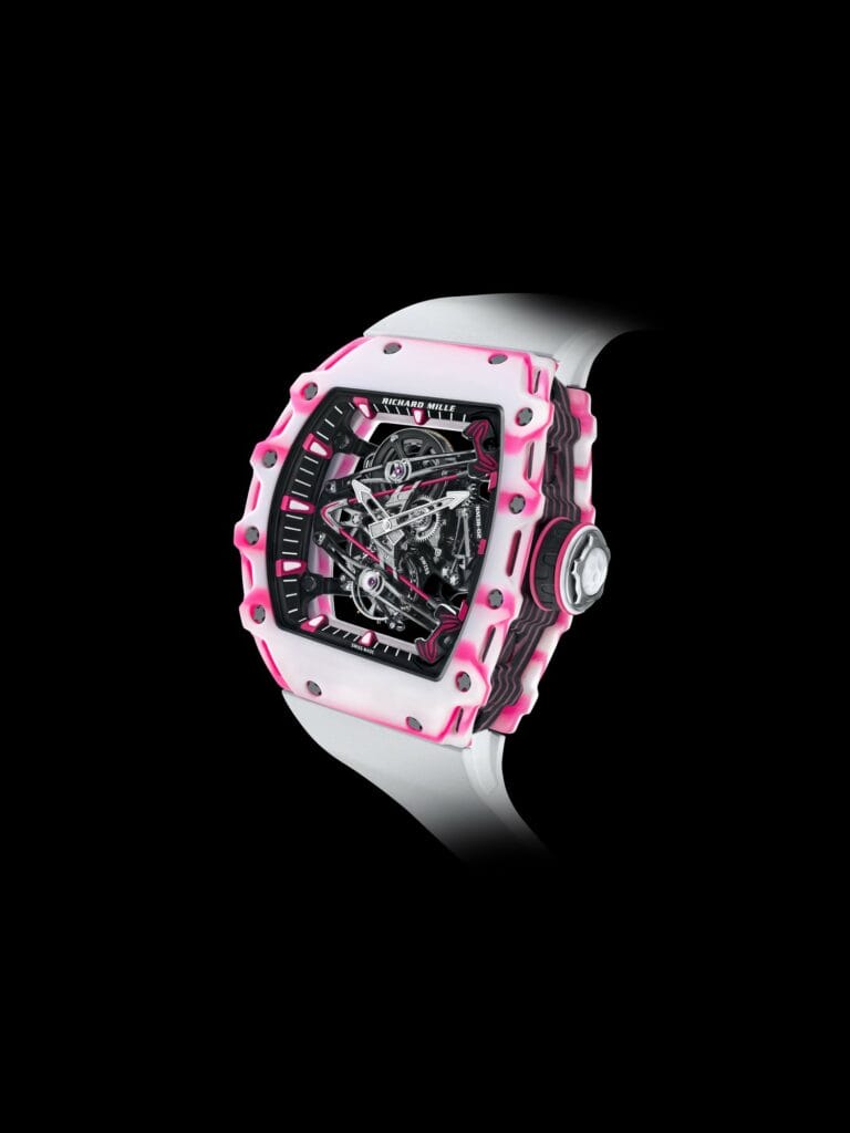 La conception et la réalisation de la montre suivent une approche conceptuelle complète englobant le mouvement, le boîtier et le cadran. De ce fait, tout a été fabriqué en suivant des spécifications extrêmement rigoureuses. La lunette et le fond sont en Quartz TPT® rose et blanc, tandis que la carrure combine des couches de Carbone TPT® et de Quartz TPT® rose. Le Carbone TPT® et le Quartz TPT® sont des matériaux au rendu incomparable et leur utilisation par la marque est une exclusivité dans le monde de l’horlogerie. Leurs surfaces impeccables arborent des stries aux motifs damassés totalement uniques, car elles sont composées de nombreuses couches de filaments disposés en parallèle, obtenus en séparant des fibres de silice ou de carbone. D’une épaisseur maximale de 45 microns, les couches de silice du Quartz TPT® sont imprégnées d’une résine rose développée spécialement pour Richard Mille, puis appliquées par une machine spéciale qui modifie l’orientation des fibres de 45° entre les couches de silice blanche et celles colorées en rose, ou entre les couches de silice colorée en rose et celles de Carbone TPT®. La forme asymétrique du boîtier empêche la couronne dynamométrique de frotter contre le poignet. Le boîtier est étanche jusqu’à 50 mètres, grâce à deux joints toriques en Nitrile. Il est assemblé au moyen de 12 vis spline en titane grade 5 et de rondelles en acier inoxydable 316L résistantes à l’usure.