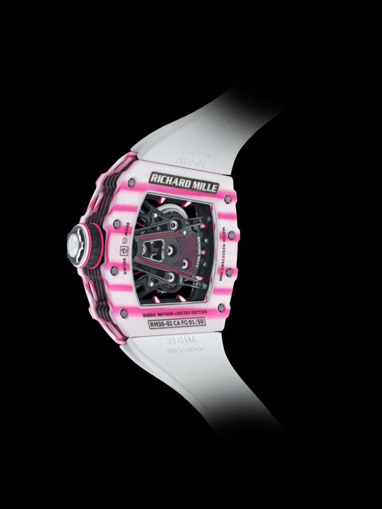 « J’ai insisté dix ans auprès de Richard pour obtenir une montre rose, et la voilà ! » a déclaré Bubba Watson en découvrant la RM 38-02 Tourbillon. Inspirée par l’audace des calibres précédents signés Bubba Watson et par sa couleur « porte-bonheur », la RM 38-02 est construite autour d’une platine en Carbone TPT®, un matériau composé de multiples couches de filaments de carbone parallèles. Omniprésent sur la RM 38-02, ce matériau est très exigeant en terme d’usinage non seulement à cause de sa dureté mais aussi du travail de squelettage. À l’instar de la montre finie, la platine a passé de nombreux tests complets pour garantir que ce dernier n’affecte en rien ses propriétés mécaniques.