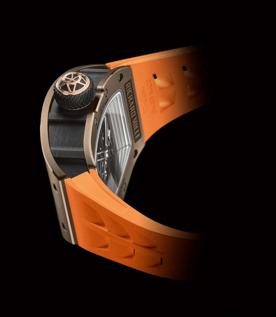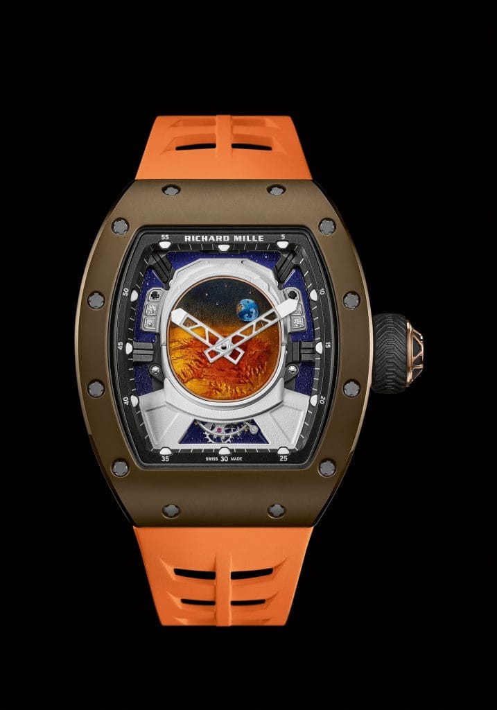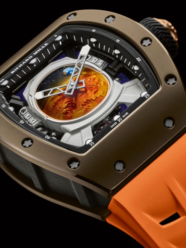 Le casque en titane grade 5 qui repose sur une structure stylisant la partie supérieure d’une combinaison spatiale, également en titane grade 5, assure la connexion du cadran au mouvement sous-jacent. Il a été peint en blanc au moyen d’un aérographe initialement élaboré pour l’intervention du street artist Kongo sur la RM 68-01 Tourbillon.