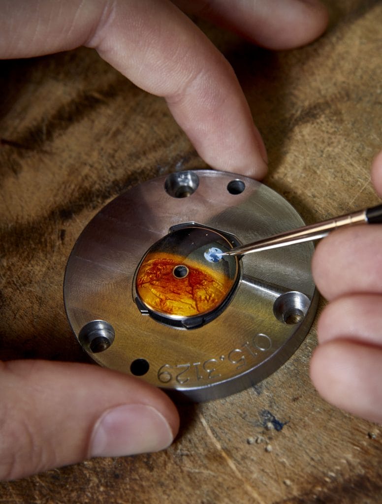 Pour traduire cette scène martienne imaginaire, la visière en or 5N bombée a été successivement gravée au moyen de burins spécialement créés, émaillée grand feu puis peinte à la main. La gravure en elle-même requiert 15 heures pour chaque pièce, complétées d’une journée réservée à l’émaillage grand feu. Il a fallu toute la patience, l’habileté et la dextérité de Pierre-Alain Lozeron pour mener à bien ces créations.