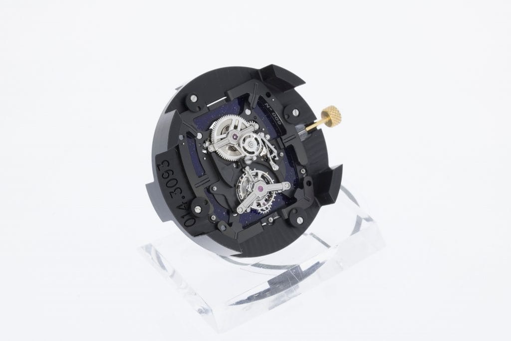 Les différents éléments prennent vie au sein d’un nouveau calibre tourbillon, remarquable tant par la subtilité du style que par le souci du détail. À l’instar d’une navette spatiale, la platine de mouvement est fabriquée en titane grade 5 à travers laquelle il est possible d’apercevoir au dos de la montre les ponts en titane grade 5, squelettés pour évoquer les plateformes de lancement des fusées. Cette platine comporte de larges inserts en verre aventuriné bleu scintillant, évoquant l’espace et les millions d’étoiles qui brillent aux confins de l’univers.