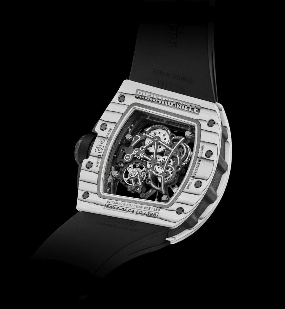 Avec la RM 61-01 Ultimate Edition, la céramique TZP a cédé la place au Quartz TPT® et au Carbone TPT® pour la lunette et le fond, ce dernier étant également employé pour la carrure. D’une épaisseur maximale de 45 microns, les couches de silice du Quartz TPT® sont intercalées avec des couches de Carbone TPT® par un système de dépose automatisé qui modifie l’orientation des fibres de 45° entre chaque. Chauffés ensuite à 120° dans un autoclave à une pression de 6 bars, ces composites sont prêts à être usinés dans les ateliers de la marque. Les différentes strates de Quartz TPT® et de Carbone TPT® révélées de manière aléatoire font de chaque boîtier une pièce unique. Tandis que les lignes étirées entre 2 et 5 heures permettent de supprimer tout frottement sur le poignet du sprinteur, le boîtier dispose de protège-couronne en Carbone TPT® qui en assurent la protection lors des activités sportives.