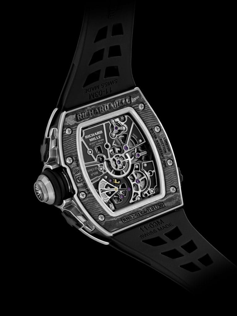 La RM 62-01 présente une double lunette, une en titane poli et satiné, la seconde lunette est usinée dans un bloc de Carbone TPT® de seulement 1,8 mm d’épaisseur. Le choix de ces matériaux va au-delà de la seule quête esthétique : la combinaison titane/Carbone TPT® offre également le meilleur rapport poids-rigidité dans le contexte fonctionnel de la RM 62-01. Elle assure que les vibrations de l’alarme seront bien transmises au poignet, moyen de les dévier du mouvement qui est ainsi protégé par la structure même de la montre.