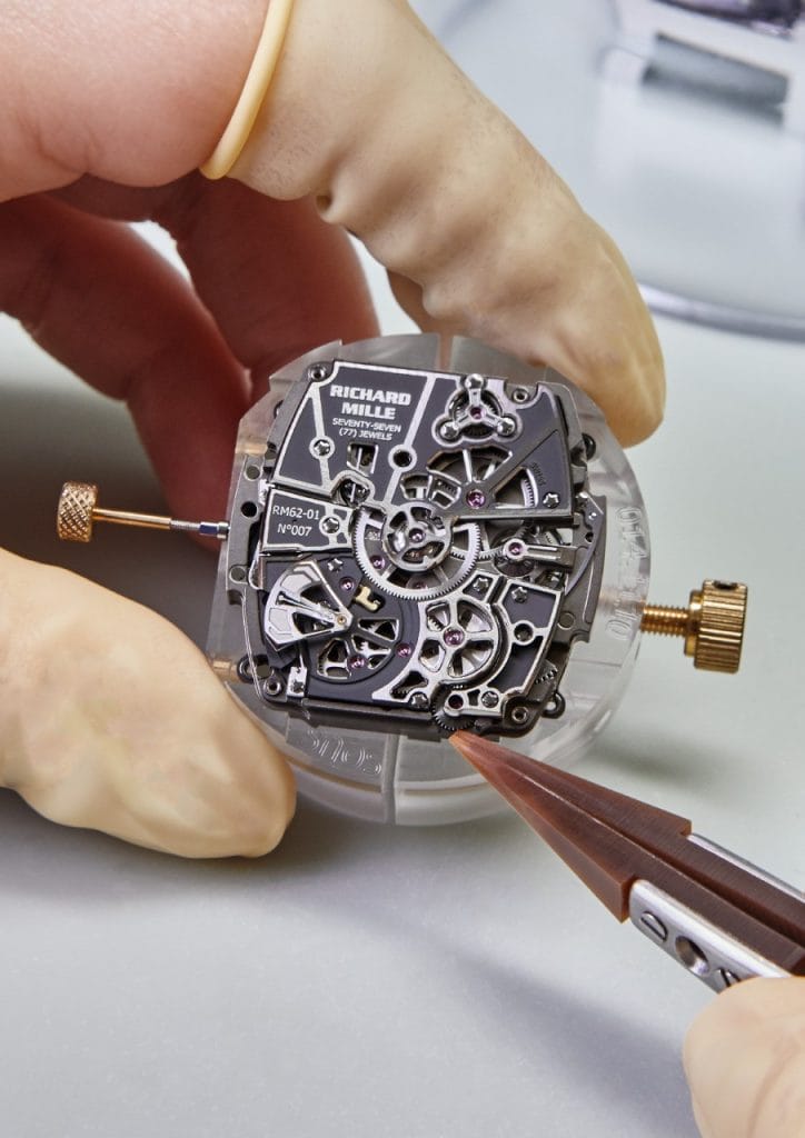 Cette alarme par vibration ne devait pas altérer le fonctionnement du mouvement. Ainsi est née l’idée d’utiliser une masse excentrée en or massif, semblable à un rotor d’automatique, et inspirée des anciens vibreurs de téléphone portable. « Avant de réaliser un mouvement entier, diverses questions techniques liées aux vibrations dans le cœur même du mouvement ont dû être résolues. Quatre prototypes partiels, beaucoup de travail sur les maquettes et les contraintes d’encombrement ont été nécessaires pour pouvoir intégrer autant de composants et de fonctions dans un volume contenu. Il fallait loger 816 composants, 2 barillets, 7 aiguilles, 11 affichages et une cage de tourbillon. L’un de nos constructeurs a donc travaillé pendant cinq ans à plein temps, parfois avec l’aide d’un autre constructeur, avec réunion de suivi chaque quinzaine », explique Salvador Arbona, directeur technique mouvement de Richard Mille. Pour toutes ces raisons, la RM 62-01 est la montre la plus complexe que Richard Mille ait jamais créée.