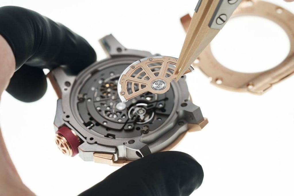 Les finitions témoignent du niveau d’exigence propre à la maison. Angles polis, contours étirés, ponts microbillés traités PVD et électro-plasma, cerclage des rouages, chaque composant reflète une recherche d’harmonie entre performance et esthétique.