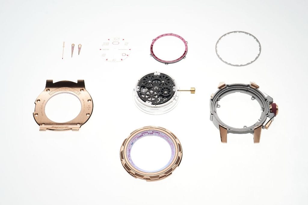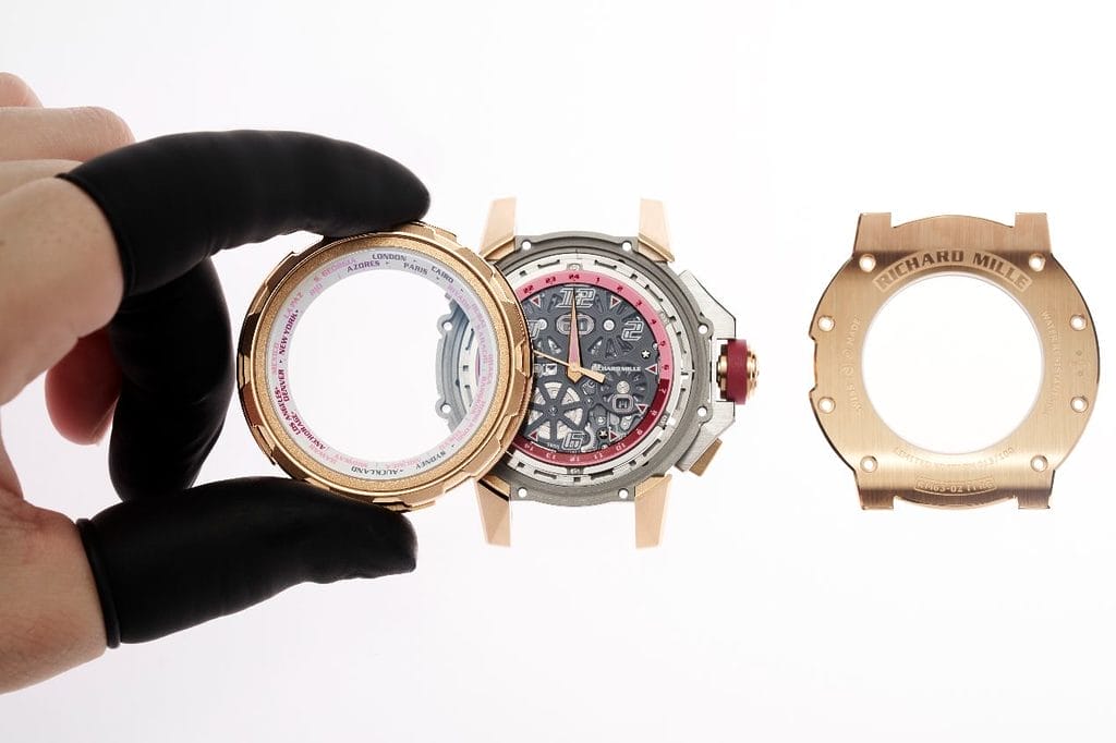 Cette construction tripartite ne relève pas du simple exercice de style. Le boîtier est composé de 106 éléments, dont une partie significative est dédiée exclusivement à la gestion de la complication heure universelle intégrée à la lunette. Une architecture complexe qui a nécessité un ajustement d’une extrême précision afin de garantir fiabilité et durabilité.