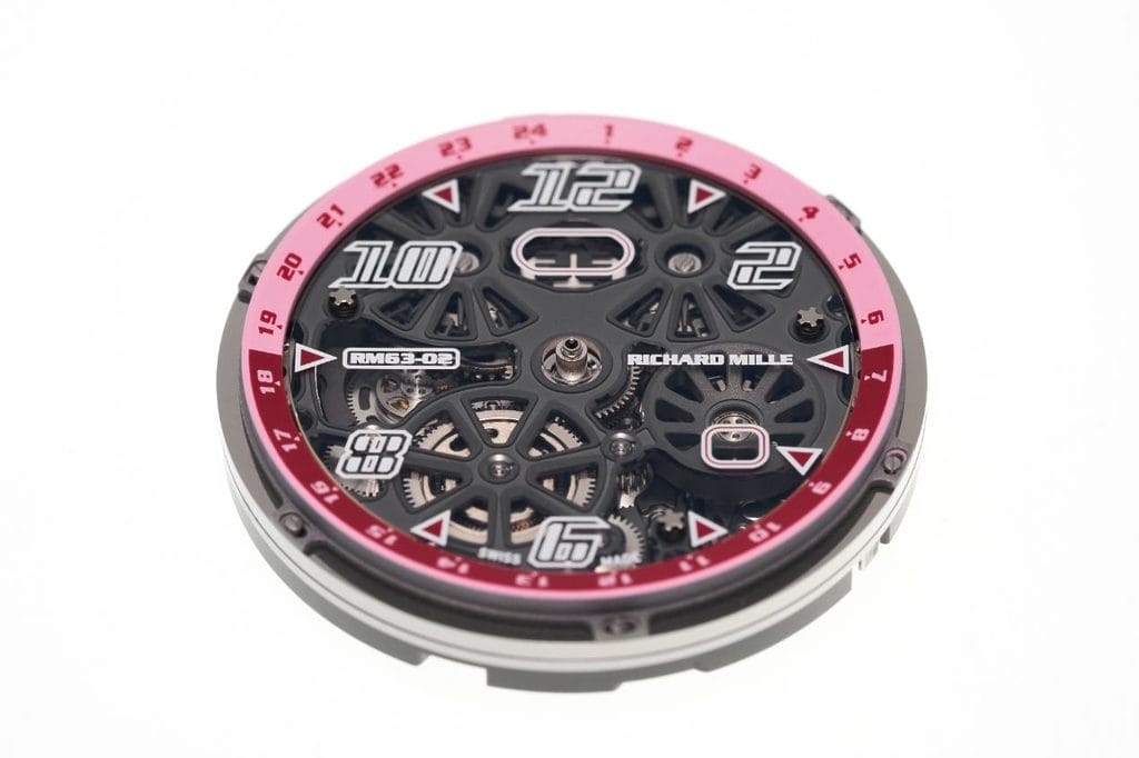 Au cœur de la RM 63-02 bat le calibre automatique CRMA4, entièrement développé au sein de la manufacture Richard Mille. Platine et ponts en titane grade 5 forment une base à la fois légère, rigide et stable, idéale pour accueillir une complication aussi sophistiquée.
