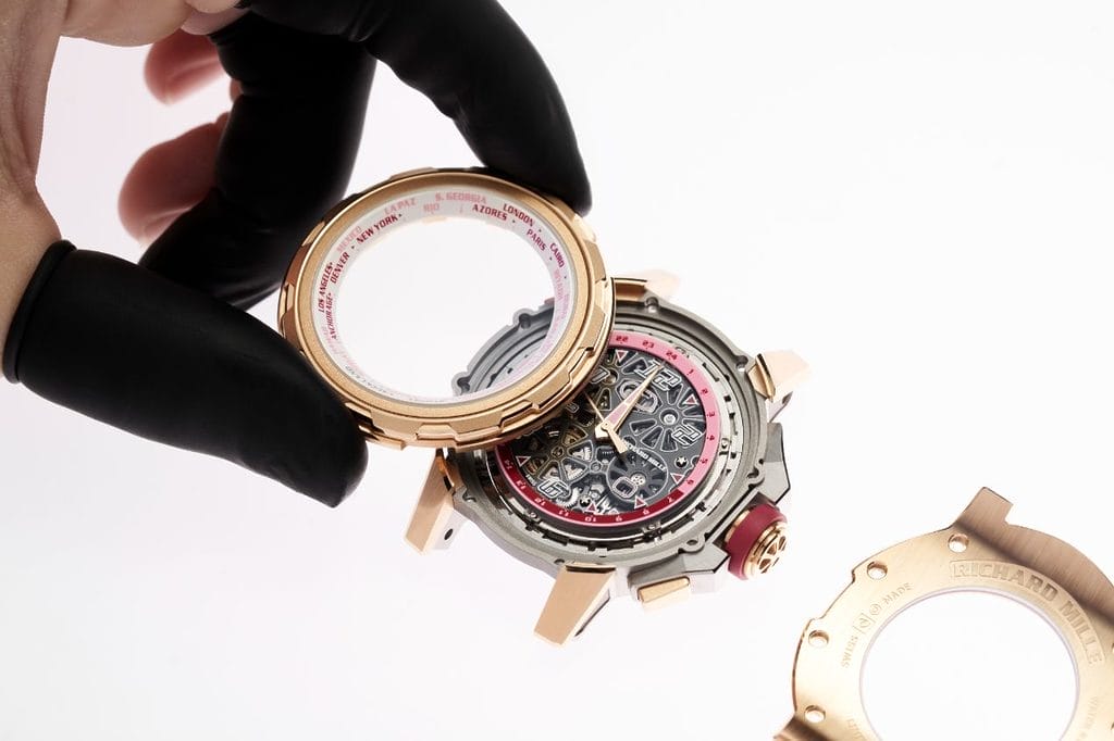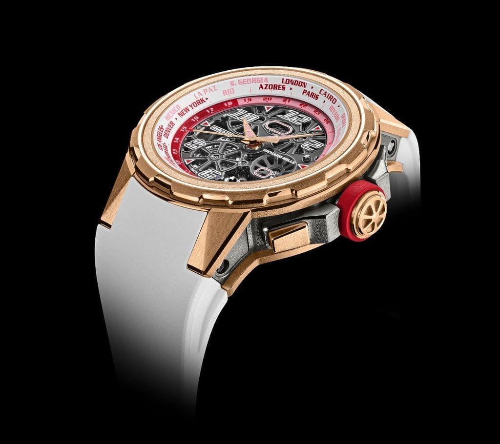 Lire l’heure aux quatre coins du globe fait partie de ces complications aussi poétiques que techniques. Traditionnellement associée à des disques, des poussoirs ou des couronnes secondaires, l’heure universelle impose souvent une gestuelle précise et parfois contraignante. Richard Mille a choisi d’en faire un acte instinctif, presque ludique.