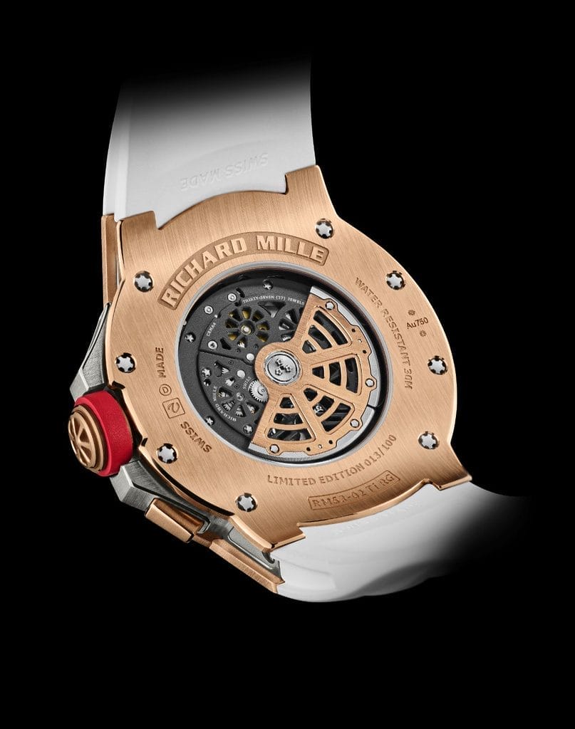 La RM 63-02 adopte un boîtier rond de 47 millimètres de diamètre pour 13,85 millimètres d’épaisseur. Une silhouette puissante mais parfaitement maîtrisée, réalisée en or rouge 5N satiné avec des biseaux polis, associée à une carrure en titane grade 5 aux finitions identiques.