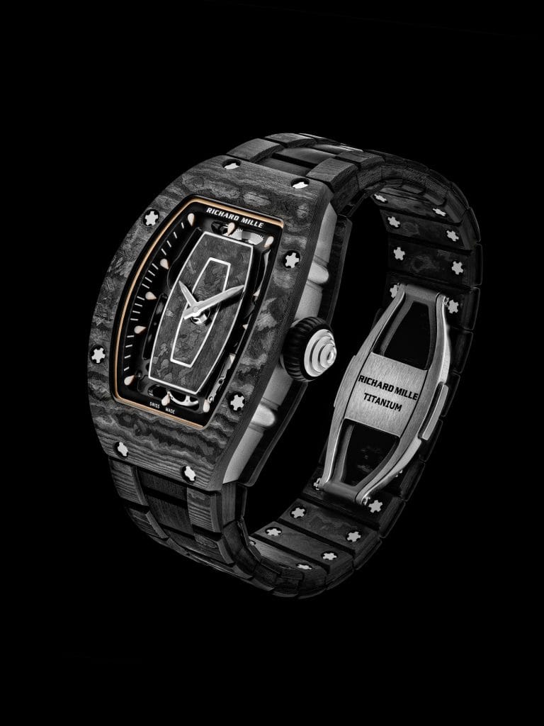 Entièrement revêtue de Carbone TPT® et de titane, de la lunette à la boucle déployante, la RM 07-01 Ladies associe la complexité architecturale d’un bracelet métallique, constitué de 200 composants, et l’élégance d’un matériau technique. Le bracelet est composé de dizaines de plaquettes en Carbone TPT® maintenues sur un squelette en titane grade 5 grâce à ses 44 vis spline si caractéristiques de Richard Mille.