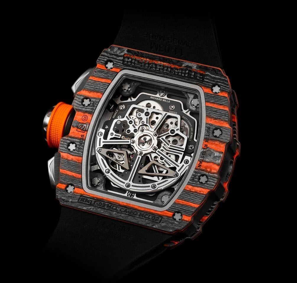L’association d’un inédit Quartz TPT® orange – rappel de la couleur historique de l’écurie anglaise – combiné au Carbone TPT® contribue aux meilleures performances mécaniques de la RM 11-03 et offre une résistance à un environnement agressif. Les poussoirs en titane assemblés sur la carrure en Carbone TPT® reprennent le dessin des feux de la 720S. De forme similaire aux prises d’air de l’iconique McLaren F1, les inserts en titane siglés McLaren habillent la lunette. La complexe couronne en titane grade 5 reprend la forme d’une roue McLaren. On retrouve également l’apostrophe McLaren au coeur de la matière sur le bracelet au caoutchouc, développé spécialement pour cette pièce.