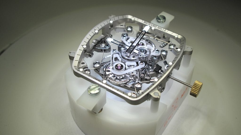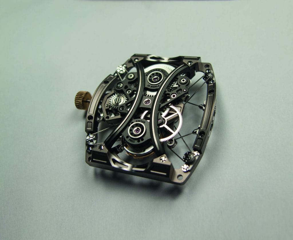 L’ennemi de tout mouvement tourbillon, c’est le choc. La solution de Richard Mille ? Un mouvement suspendu par câble. L’architecture atypique de cette construction a nécessité le développement de deux platines. La première, dite périphérique, est fixée au châssis et supporte les mécanismes de mise sous tension. La seconde, dite centrale, est reliée par câbles à la platine périphérique et intègre l’ensemble des rouages du calibre ainsi que le mécanisme de remontage.