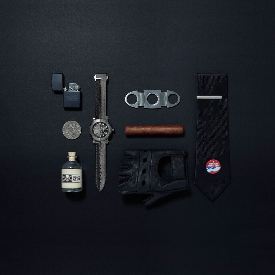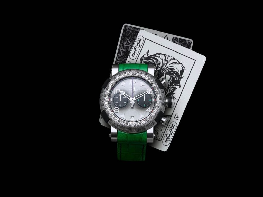 Les aiguilles ARRAW de la montre adoptent une forme unique, avec une pointe en forme d’as, un motif que l’on retrouve sur les index du cadran. L’aiguille des secondes du chronographe est quant à elle revêtue de violet, la couleur du Joker, et sa base façonnée en forme de J.