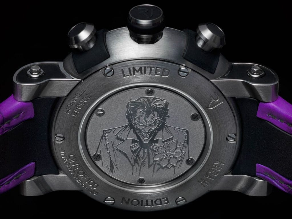 Sur le fond du boîtier en titane se trouve un étonnant portrait du Joker gravé au laser. Chaque montre est numérotée et porte la mention « One of 100 Limited Edition ».