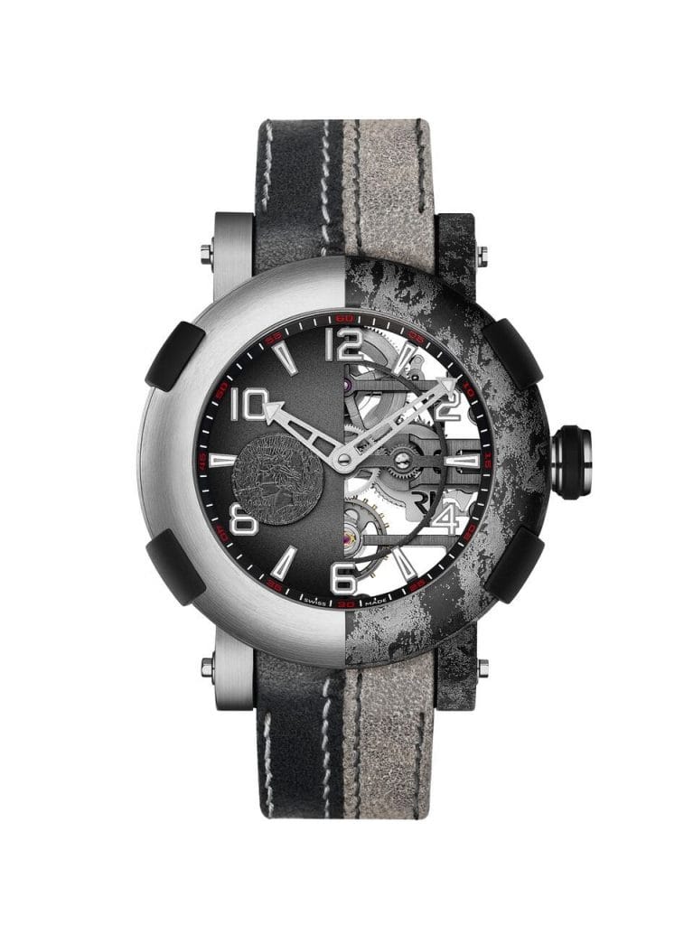 La montre « Two-Face » est équipée d’un mouvement squelette à remontage manuel partiellement exposé, doté d’une réserve de marche de 48 heures. Conçu par RJ, ce mouvement présente des bords chanfreinés et des angles tirés. Il repose au cœur d’un boîtier ARRAW de 45 mm en titane satiné circulaire rehaussé des quatre RJ BumpersTM, des cornes profilées et des aiguilles en forme de flèche, éléments emblématiques des modèles ARRAW.