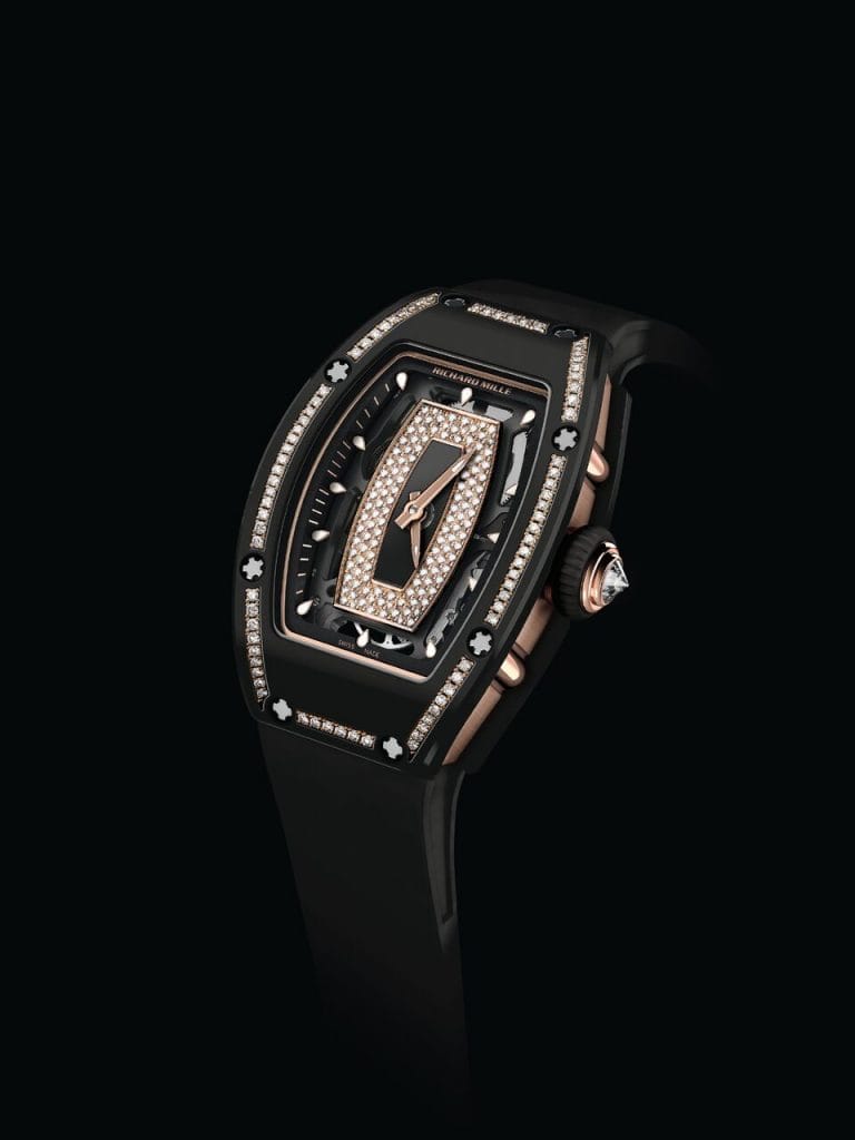 Avec de nombreuses références disponibles, la collection Femme permet déjà à chacune de trouver montre à son poignet, Richard Mille vient ajouter à la variété des matériaux, sertissages, bracelets déjà proposés l’exclusivité de la céramique sertie.