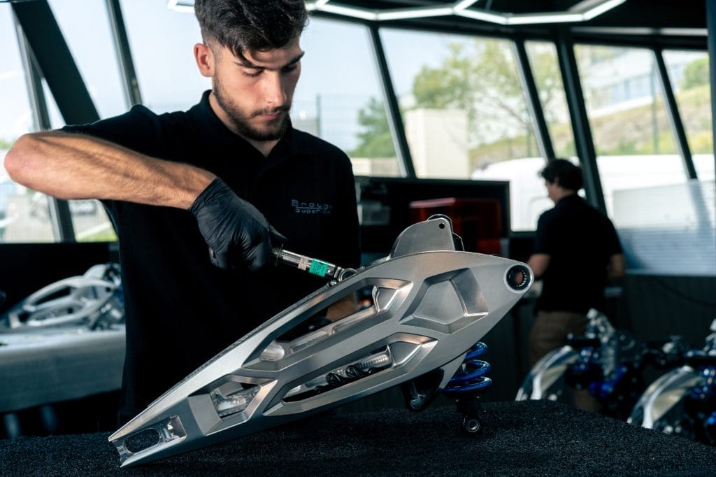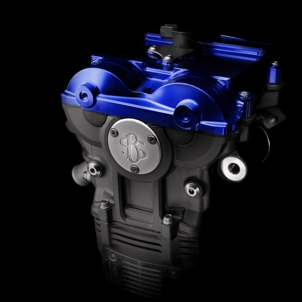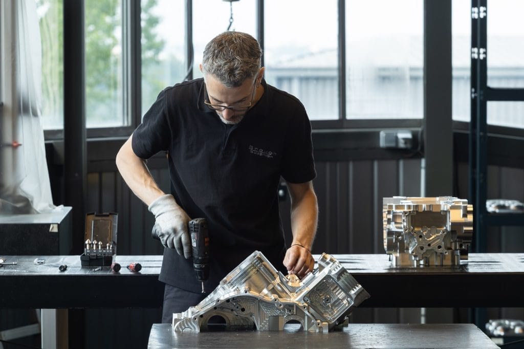 Le cœur de la RMB01 est un bicylindre de 997 cm³, entièrement usiné dans des blocs d’aluminium série 5000, à forte teneur en magnésium. Sur les 160 kg de matière brute, seuls 23 kg de composants finaux subsistent, révélant une optimisation extrême par usinage de précision.