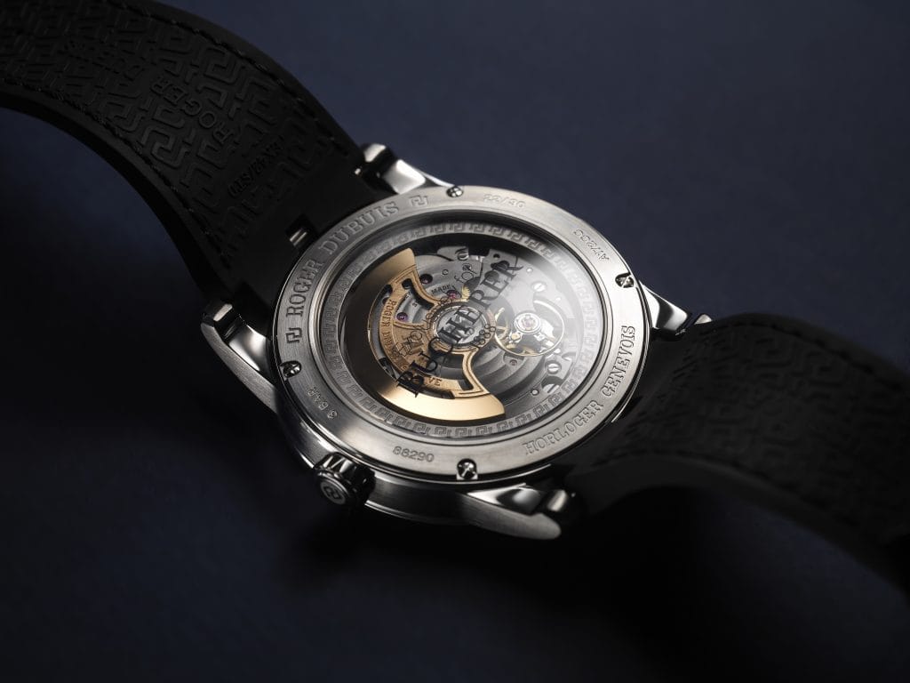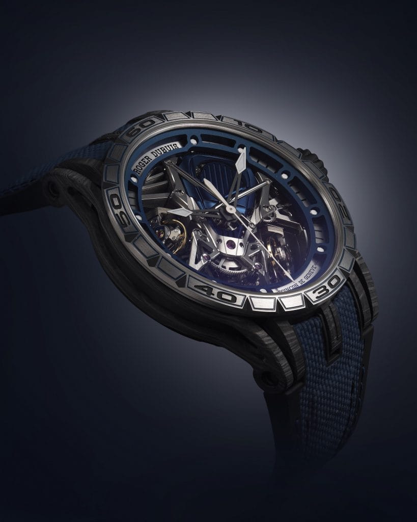 Marquant le début d’un partenariat unique avec Lamborghini Squadra Corse, ce garde-temps a été conçu dans le respect des codes appliqués aux supercars de la marque italienne. Son boitier en carbone SMC de 45mm abrite le calibre Duotor qui se distingue par ses barres stabilisatrices qui reprennent le principe de l’emblématique AstralSqueleton de Roger Dubuis.