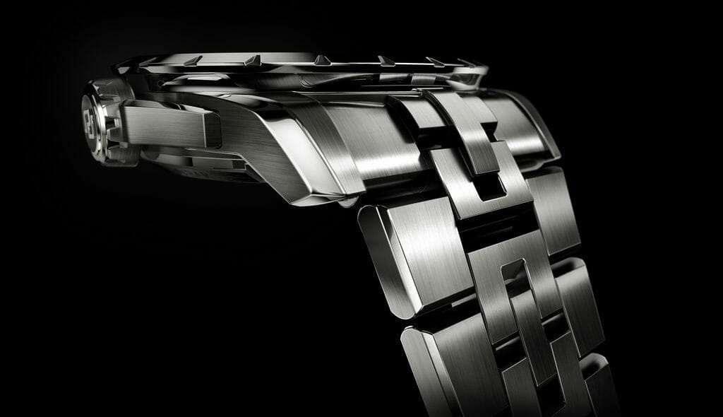 Pour offrir à la montre un style complètement métallique, son bracelet est également confectionné en titane. Les maillons de ce dernier ont été habilement raccourcis. Cette modification subtile de l’articulation permet une meilleure adhésion au poignet. Cette évolution améliore grandement la manière dont le bracelet repose et bouge sur la peau. Mais elle ne serait pas complète sans le système de libération rapide signature, qui garantit confort et polyvalence à celui qui porte la montre, où qu’il se trouve.