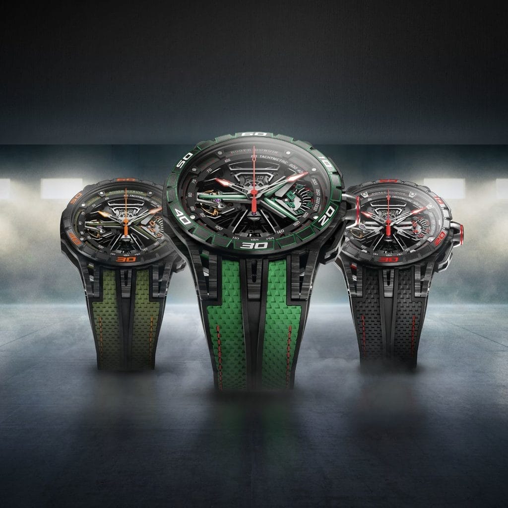 Cette année, pour ses 10 ans sur les circuits, Lamborghini atteint le plus haut niveau des sports automobiles à roues couvertes dans la catégorie Le Mans Daytona h. Pour l’occasion le nouveau modèle SC63 est injecté de Verde Mantis, l’emblématique couleur de Lamborghini. Roger Dubuis rend hommage à cet anniversaire en adoptant la même teinte pour ses nouvelles montres de 45 mm.