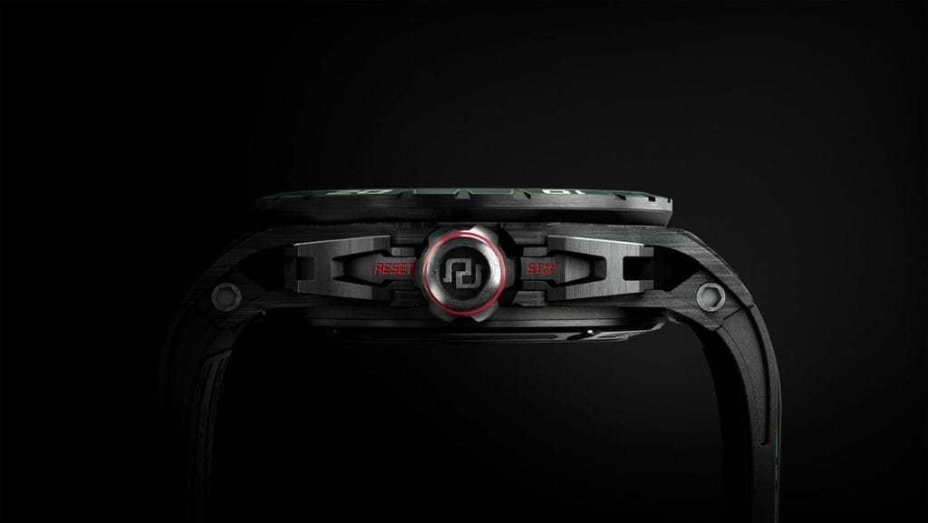 Le boîtier est construit dans un carbone gris léger, qui s’harmonise parfaitement avec les teintes de Verde Mantis. Il affiche les lignes tranchantes, les encoches essentielles et la symétrie précise, typiques de la collection Excalibur Spider. Quant à la lunette en céramique, elle est hyper-résistante aux agressions et ne se ternit pas avec le temps.