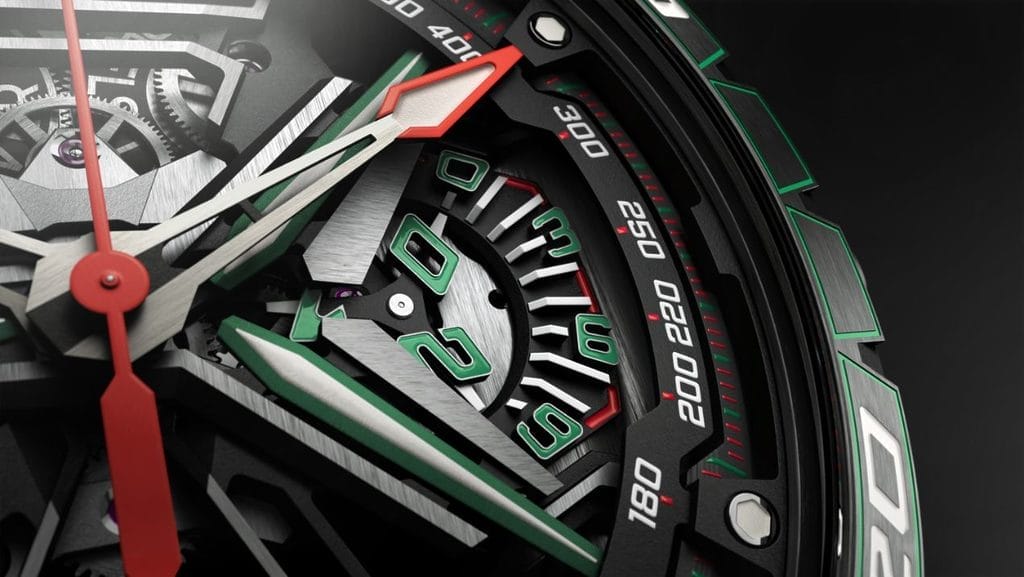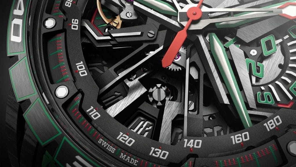 En édition limitée de seulement 88 pièces, le modèle Verde Mantis rejoint deux autres versions de la série Flyback Chronograph, l’une en rouge et noir, et l’autre en kaki, vert et orange. Ces trois pièces spectaculaires offrent ainsi une gamme complète de couleurs, qui permet aux amateurs de sports mécaniques d’exprimer leur singularité les jours de course.