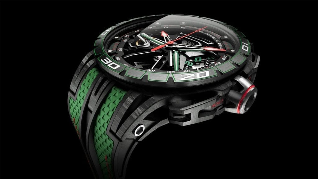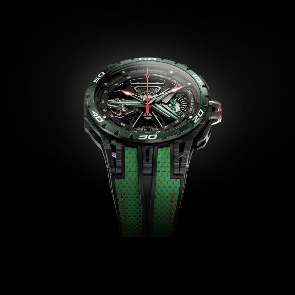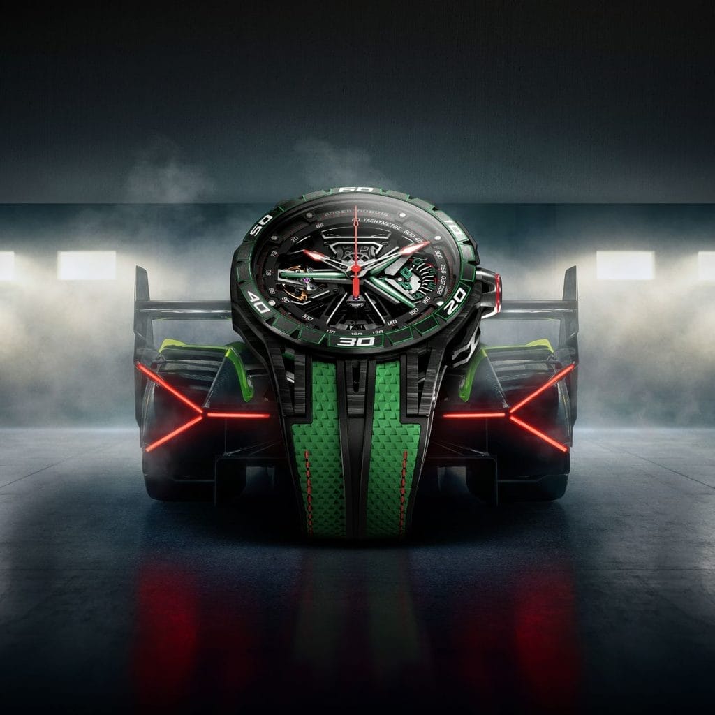Avec ce modèle, Roger Dubuis rend un nouvel hommage à Lamborghini Squadra Corse, son partenaire de longue date, dont les voitures de course atteignent le plus haut niveau en participant à la série Le Mans Daytona h. L’artisanat expressif de l’horloger est injecté de la couleur signature Verde Mantis, teinte emblématique des livrées de Lamborghini Squadra Corse depuis ses débuts en course automobile, il y a plus de dix ans.