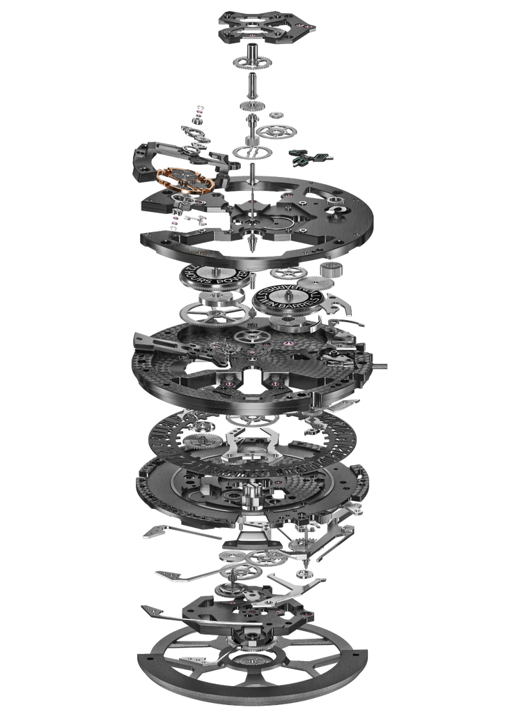 Roger Dubuis fait preuve d’une approche contemporaine en matière de haute horlogerie dès le début du processus. Les horlogers ont ainsi carte blanche pour laisser libre cours à leur créativité, afin de construire un tout nouveau calibre, intégrant le chronographe dans un mouvement. La réalisation de ce concept audacieux, très loin des méthodes rationalisées et modulaires, qui consistent à ajouter un chronographe à un mouvement existant, exige plusieurs mois de travail minutieux. Chaque minute supplémentaire est investie pour créer le calibre autour du temps dans son entièreté : il le donne et le mesure tout en exprimant sa propre identité esthétique.