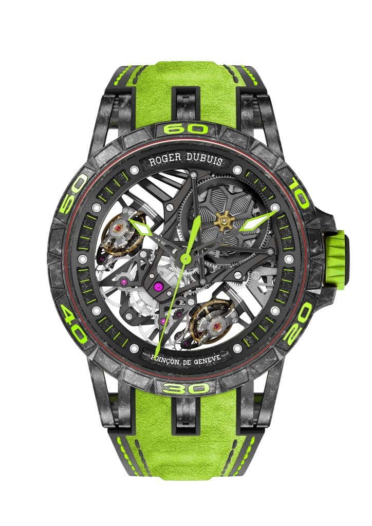 Le 29 juillet dernier, Lamborghini Squadra Corse et Roger Dubuis ont démontré leur approche résolument futuriste en dévoilant simultanément une supercar exceptionnelle et un garde-temps inspiré de leur partenariat de haut vol. Récemment revisitée, la SCV12 de Lamborghini est la première édition limitée de la supercar à moteur V12 réservée à la piste, spécialement conçue pour le Super Trofeo et la plus puissante jamais créée par Lamborghini. Elle peut dépasser les 830 ch grâce à une suralimentation aérodynamique à haute vitesse, et possède une force d’appui supérieure à celle d’une voiture GT3 ainsi qu’un aérodynamisme hors du commun. Pour créer le nouvel Excalibur Essenza SCV12, Roger Dubuis a fait évoluer son Duotor, en l’épurant de manière à améliorer sa performance, tout en harmonisant les codes graphiques du garde-temps avec ceux du bolide. Ainsi dépouillé de son pont supérieur et doté d’un tourbillon volant squelette qui imite l’enjoliveur de la Lamborghini Essenza SCV12, le barillet peut être admiré du dessus comme à travers le toit transparent d’une supercar. Les barres anti-rapprochement sur le dessus du calibre restent un détail signature des modèles Excalibur inspirés de Lamborghini.