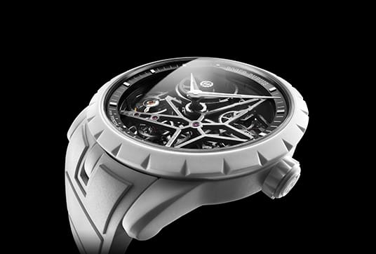 Voici l’Excalibur Monobalancier, nouvelle fierté de Roger Dubuis. Avec sa boîte en Fibre de Composite Minéral (MCF), écrin blanc immaculé du calibre automatique monobalancier squelette, elle incarne l’anticonformisme absolu de la Maison et captivera tous les regards par sa blancheur pure. Dédié aux précurseurs, afin de montrer ce qu’il se produit lorsque les codes sont réinventés et la créativité exacerbée, ce garde-temps prouve que l’Hyper Horlogerie n’a qu’une limite : l’imagination.