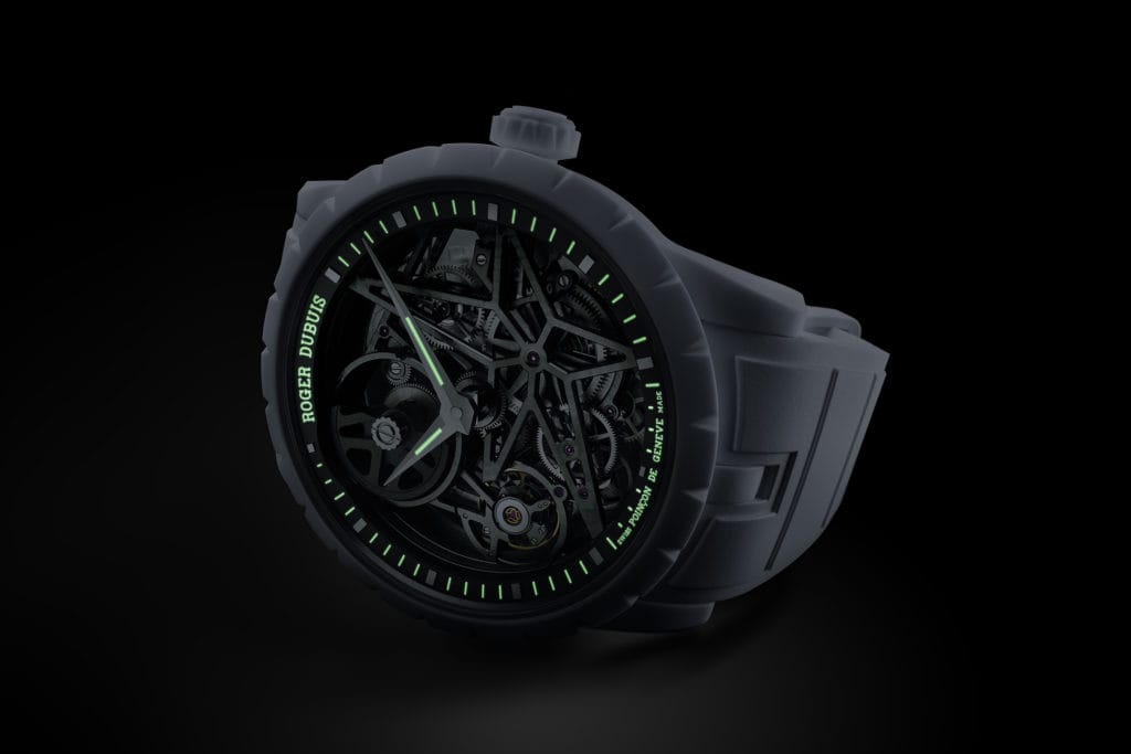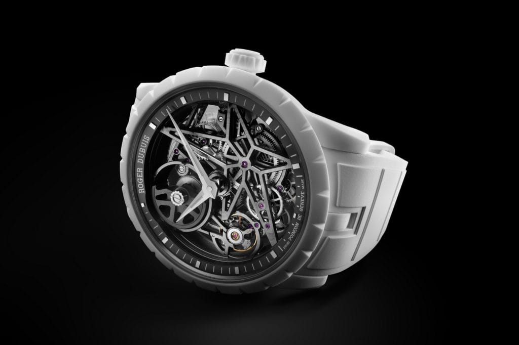 Inspiré de l’industrie aérospatiale, le MCF est un matériau blanc pur haute technologie, à la fois léger et rigide. Les maîtres horlogers de la Maison l’ont choisi pour réaliser la boîte, la lunette et la couronne de ce garde-temps de 42 mm, et signer une nouvelle œuvre d’art. Symbolisant l’excellence technique de la Maison et sa volonté de repousser les limites, le MCF est composé de 99,95 % de silice et fabriqué selon le procédé de préimprégné en feuille (SMC). Ce matériau robuste, 2,5 fois plus léger que la céramique et 13 % plus léger que le carbone SMC, permet de laisser libre cours à la créativité, de concevoir des modèles innovants et de réaliser des motifs complexes. Soucieuse de concilier confort optimal au porter et esthétique d’exception, la Maison Roger Dubuis a spécialement mis au point ce matériau afin qu’il soit stable et hautement résistant aux UV et à la lumière artificielle et naturelle, tandis que l’ajout de pigments intensifie sa blancheur. Pour rester dans la thématique du blanc intégral, rien de tel qu’un bracelet en caoutchouc blanc pour parachever l’esthétique éblouissante de ce garde-temps.