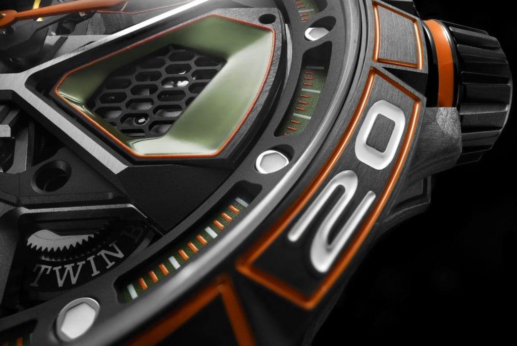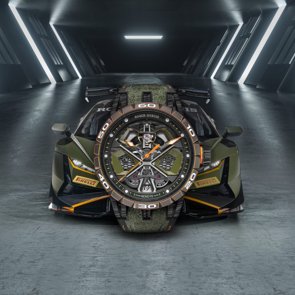 Décliné en vert kaki unique et en orange survolté, cet exceptionnel garde-temps se distingue par ses lignes fuselées et ultra-racées. Deux derniers détails inspirés des circuits s’invitent au poignet : la couronne évoquant un écrou de la Huracán, ainsi qu’une barre anti-rapprochement située sur le dessus du calibre et évoquant celle du moteur V10 de la supersportive.