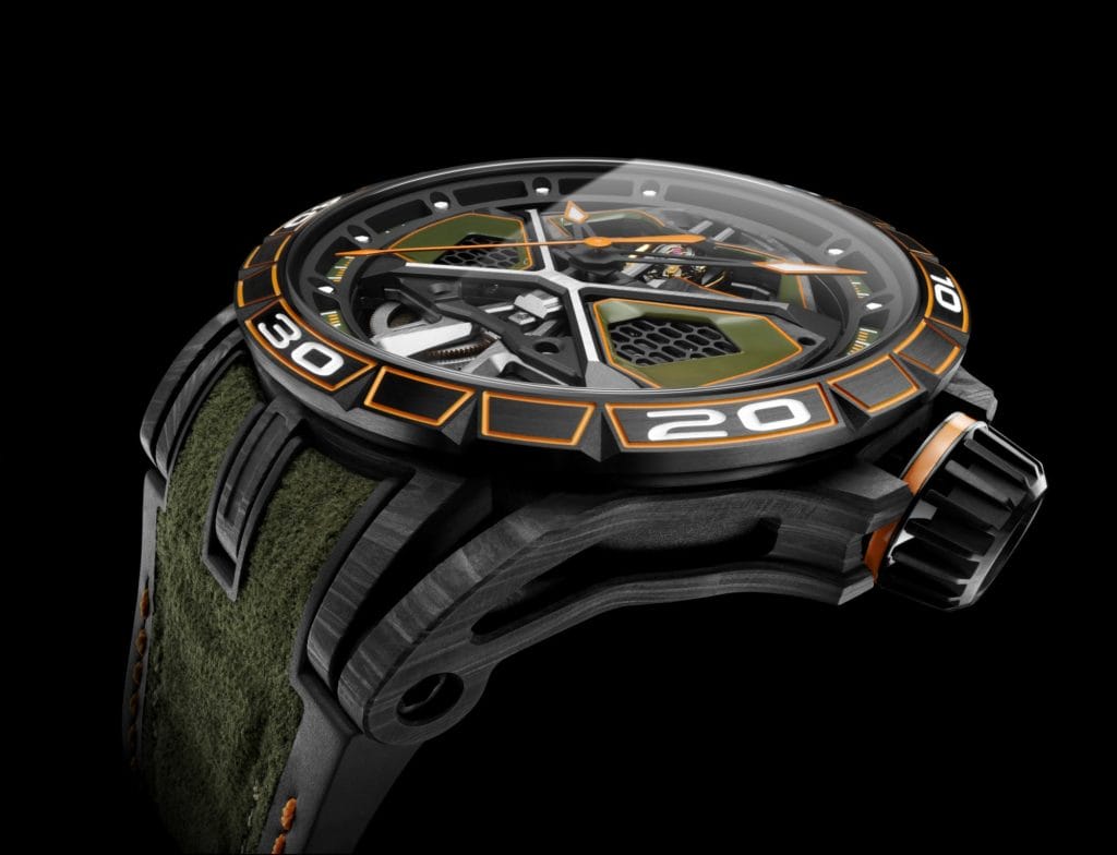Faisant la part belle aux codes de la course automobile, cette montre de pointe séduira les férus de victoire. La boîte est réalisée en carbone SMC, un matériau composite développé par la Manufacture similaire à celui du châssis monocoque et de la carrosserie de la Lamborghini Huracán, tandis que la lunette est façonnée en titane DLC noir. Puisant son inspiration dans l’aérodynamisme des supercars, Roger Dubuis a spécifiquement choisi ces matériaux pour leur légèreté et leur résistance extrêmes.