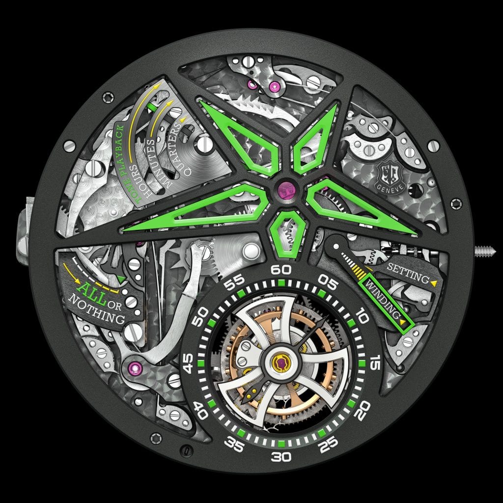 En 2019, Roger Dubuis renouvelle l’exploit et propose un retour vers le futur. La maison revisite deux de ses éléments emblématiques, fermement ancrés dans l’univers sacré des grandes complications : la répétition minute et le tourbillon volant – logés dans une boîte en carbone avec une lunette et un rehaut assortis – et fermement ancrés dans l’univers sacré des grandes complications. Doté d’un tourbillon volant et remonté par deux micro-rotors, l’Excalibur Spider Unique Series de 47 mm est un sublime exemple de haute horlogerie contemporaine. Roger Dubuis porte sa créativité et son expertise vers de nouveaux sommets en combinant deux complications prestigieuses et exclusives, et en les déclinant en carbone SMC. En outre, le bel équilibre visuel du tourbillon est renforcé par sa cage en forme d’étoile, qui offre des avantages en termes de volume et plus d’espace pour l’expression des autres éléments.